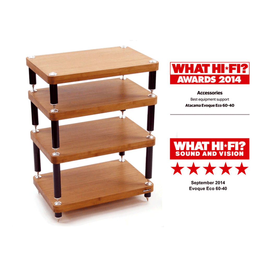All Evoque Eco modular supports feature 40mm Carbonized Bamboo with a choice of three interchangeable leg heights capable of supporting equipment up to 30kg (66 lbs) per level. The black powder coated high gloss legs fitted to the shelf modules are equipped with twin A.S.I.S.T (Atacama Sonic Isolation System Technology) dampening gaskets and carbon steel studs with aerospace grade Aluminium grounding components matched to full adjustable nickel plated 8mm steel spikes. These components are designed to both dampen and then allow residual high frequency resonance reflection to be channeled away from the supported AV components so allowing them to deliver maximum performance.