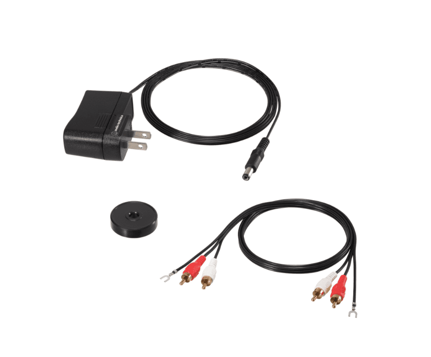 • Includes dual RCA (male) to dual RCA (male) stereo cable, 45 RPM adapter, rubber mat, and removable hinged dust cover