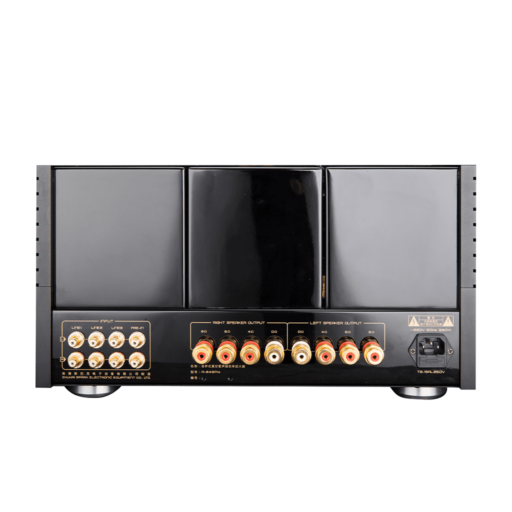 The A-845 Pro (UK) also incorporates custom designed gold plated speaker terminals and RCA terminals with 4, 6 and 8 output impedance to match any loudspeakers.