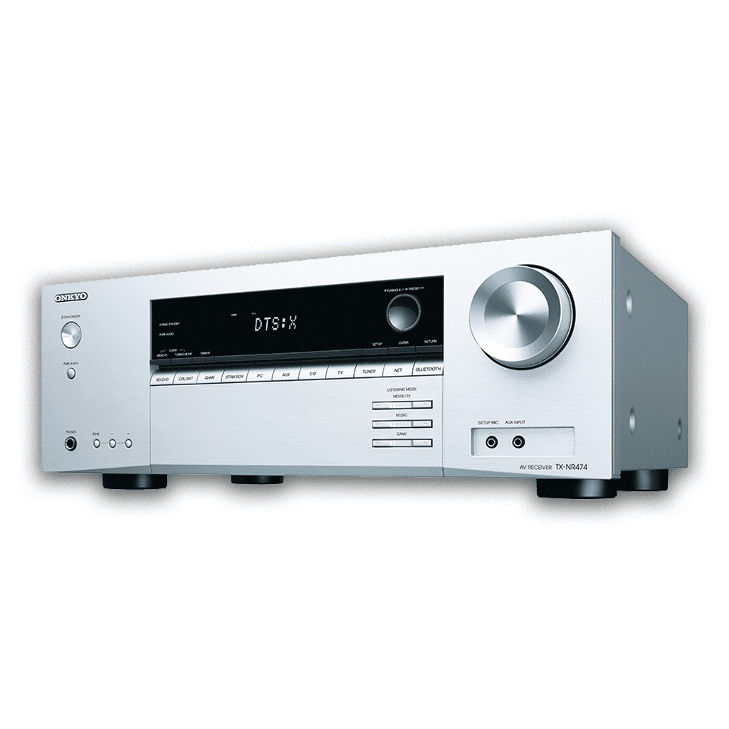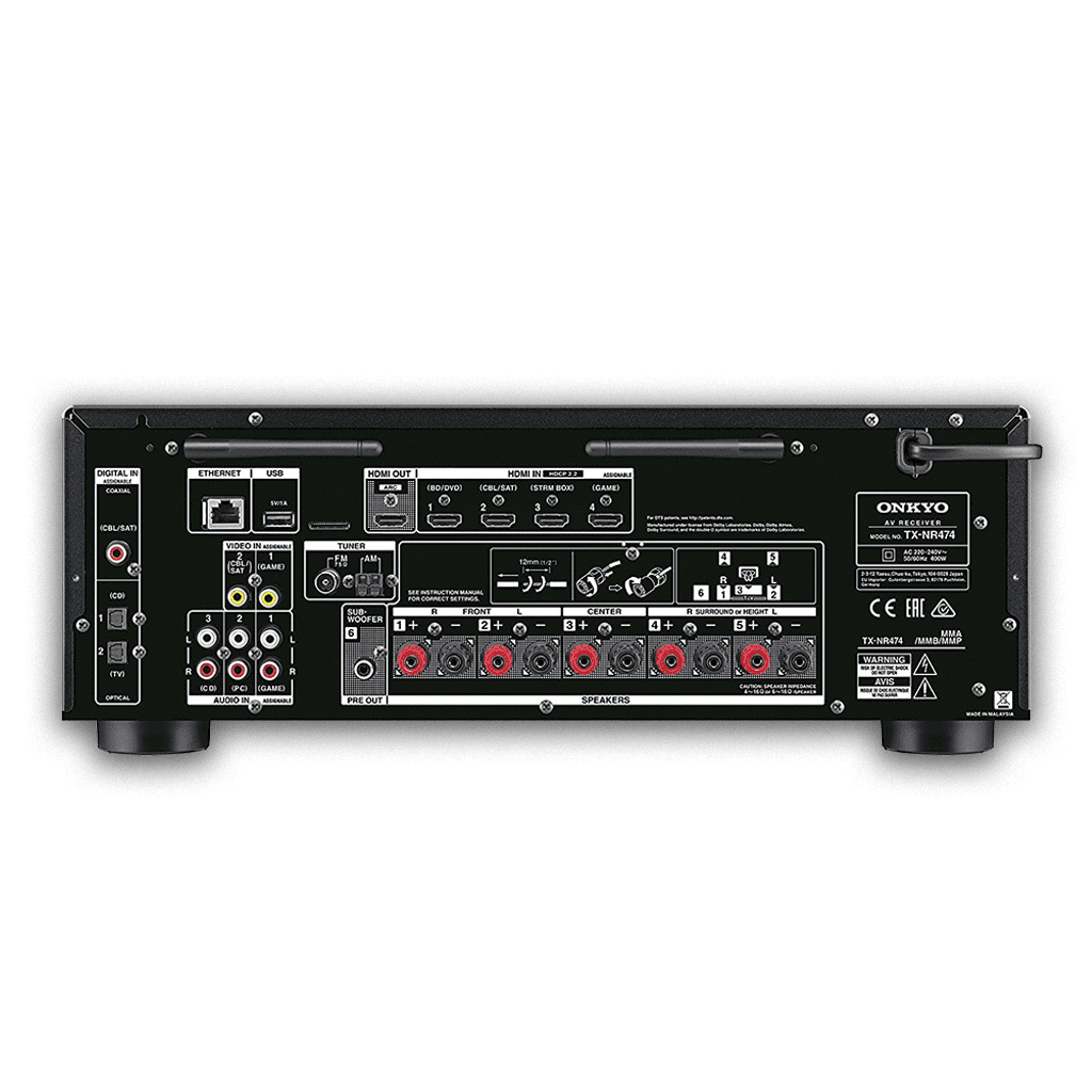 Built on a high-current amp system that effortlessly drives four-ohm speakers, the TX-NR474 has muscle to boost enjoyment of sound, whether its music, a movie soundtrack, or the Sunday football. Experience the magic of Dolby Atmos®* and DTS:X® enhancing 4K movies encoded with HDR10 or Dolby Vision via compatible Ultra HD Blu-ray Disc players thanks to the receivers 4K HDR pass-through function. You can share your music to supported wireless speakers over FlareConnect*, while dual-band Wi-Fi® provides stability for Chromecast built-in*, DTS Play-Fi®*, AirPlay, and streaming services such as Spotify®. With a slick GUI and Onkyo Controller app, operation is simple. So sit back, relax, and let the sound of happiness wash over you.